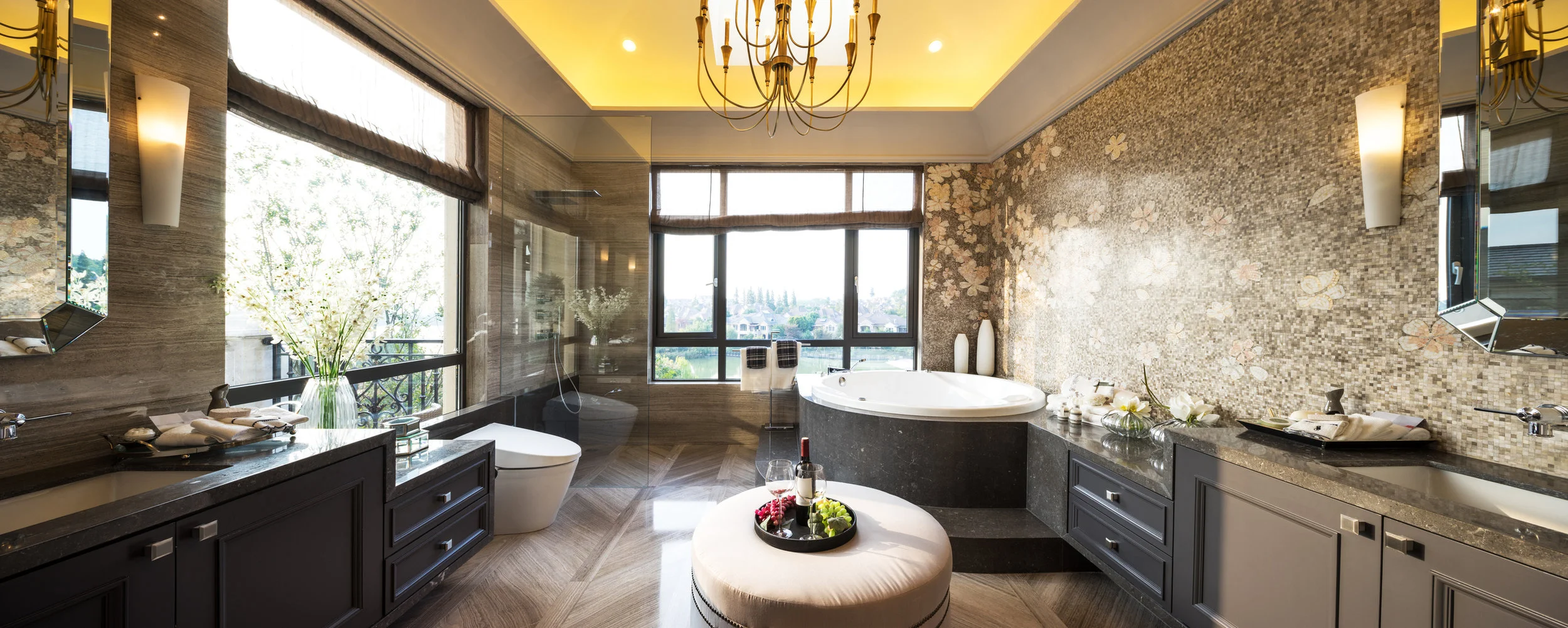 If you're for an all-white finish, we have lots of options and cabinet solutions for you to play around with. White reflects really well of glass and windows, and hightlights the other colours and materials in the room. The combination of cabinet layouts under the sink, behind the mirror and closets are limitless. In this example the client has chosen some metallic handles that feature very nicely, especially against all that white, though another option is to choose push-to-open cabinets for even another layer of convenience.
